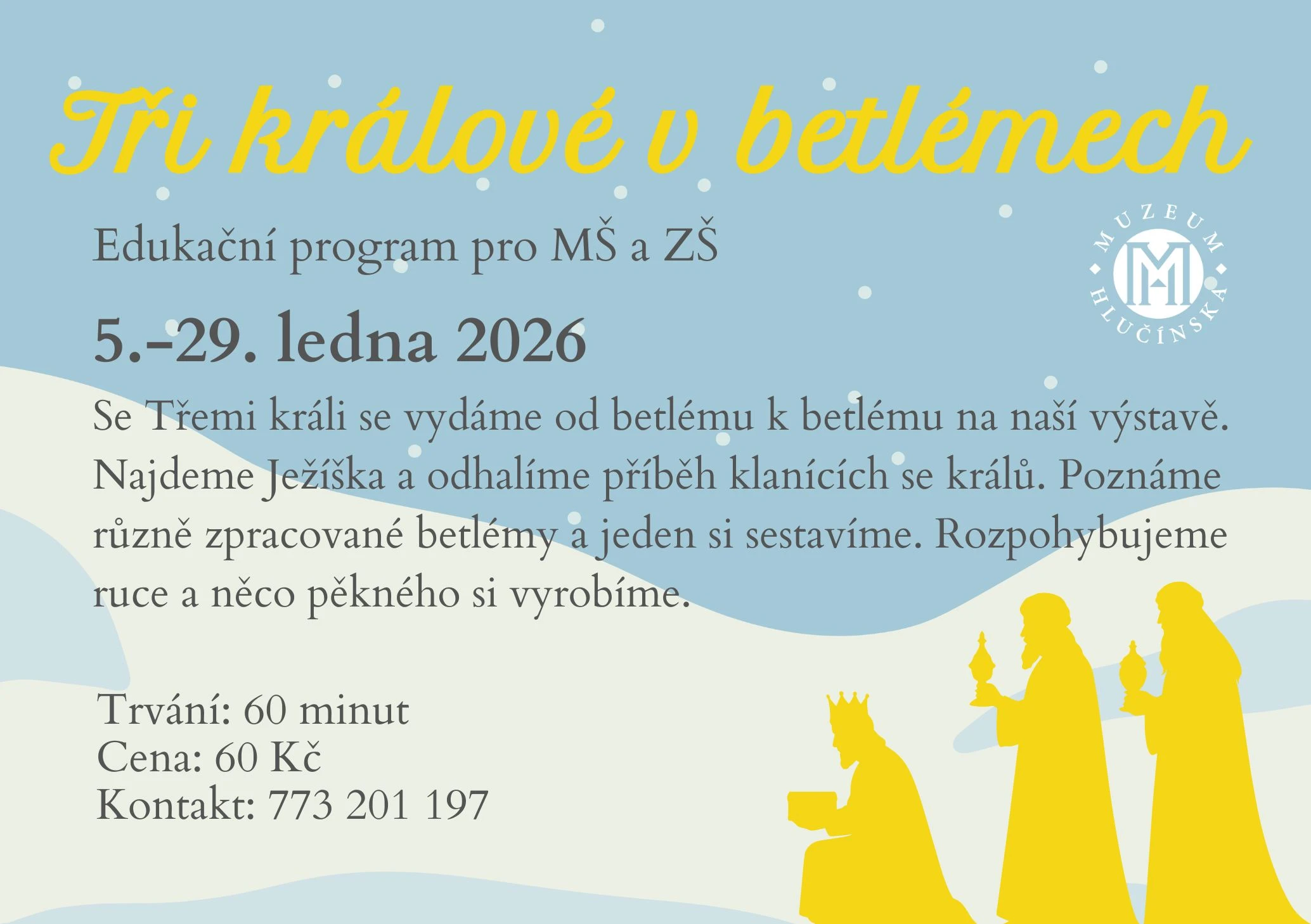 Se Třemi králi se vydáme od betlému k betlému na naší výstavě. Najdeme Ježíška a odhalíme příběh klanících se králů. Poznáme různě zpracované betlémy a jeden si sestavíme. Rozpohybujeme ruce a něco pěkného si vyrobíme.